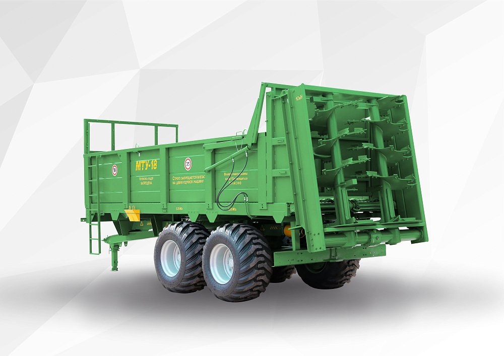 Машина МТУ-18 предназначена для транспортировки и сплошного поверхностного внесения твердых органических удобрений, а при снятом разбрасывающем органе - для перевозки других сельскохозяйственных грузов с разгрузкой конвейером назад.