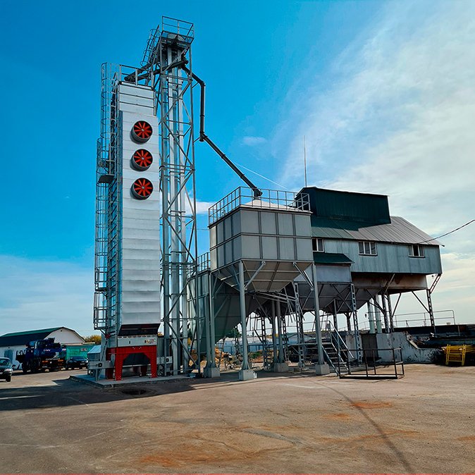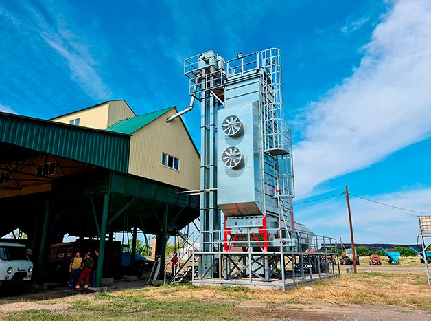 Прогретая зерновая масса начинает избавляться от избыточной влаги в окружающее ее пространство, а вентиляторы вытягивают влагу в атмосферу, таким образом происходит сушка продукта.